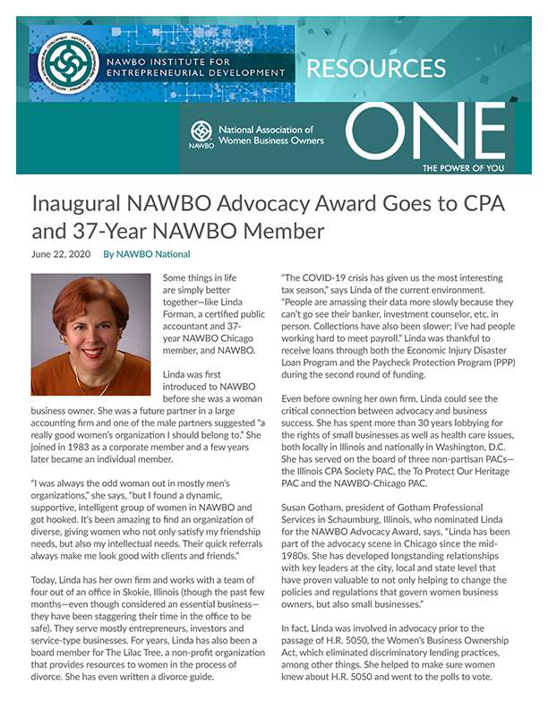 Even before owning her own firm, Linda could see the critical connection between advocacy and business success. She has spent more than 30 years lobbying for the rights of small businesses as well as health care issues, both locally in Illinois and nationally in Washington, D.C. She has served on the board of three non-partisan PACs — the Illinois CPA Society PAC, the To Protect Our Heritage PAC and the NAWBO-Chicago PAC.